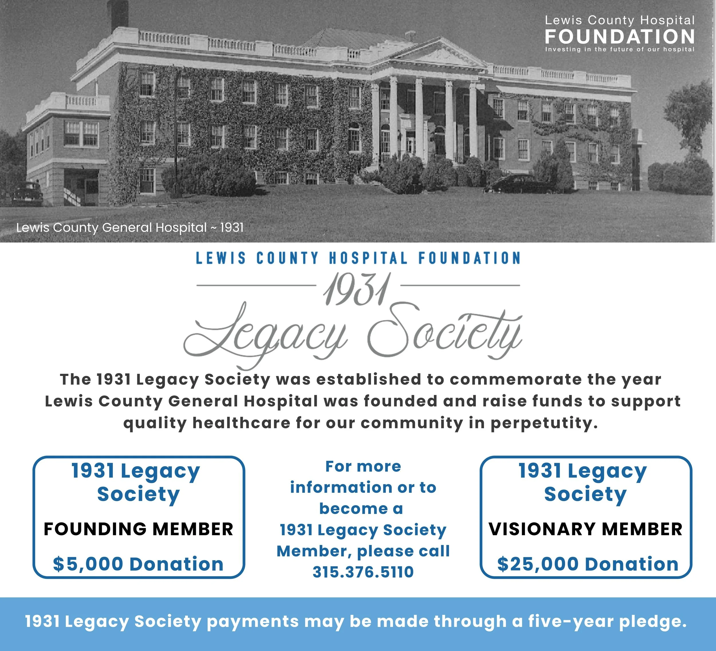 The 1931 Legacy Society was established to commemorate the year Lewis County General Hospital was established. Donors who make a minimum unrestricted gift of $5,000 (or a five-year pledge of $1,000) to the Hospital Foundation will become a Founding Member of the 1931 Legacy Society. Donors who make a minimum unrestricted gift of $25,000 (or a five-year pledge of $5,000) to the Hospital Foundation will become a Visionary Member of the 1931 Legacy Society.